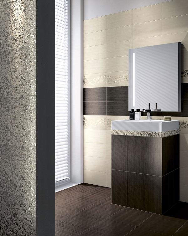 Матовая плитка Кураж представлена в белом, бежевом и шоколадно-коричневом тонах. На декоративных элементах нанесен позолоченный цветочный орнамент, который, в сочетании с теплыми тонами базовой плитки, подойдет как для современного, так и для классического интерьера.
